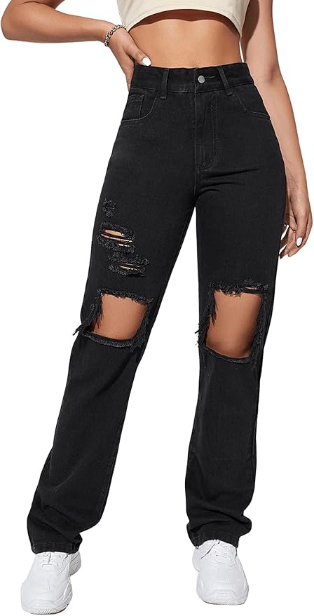 Women's Casual Loose Ripped Denim Pants Distressed Wide Leg Jeans